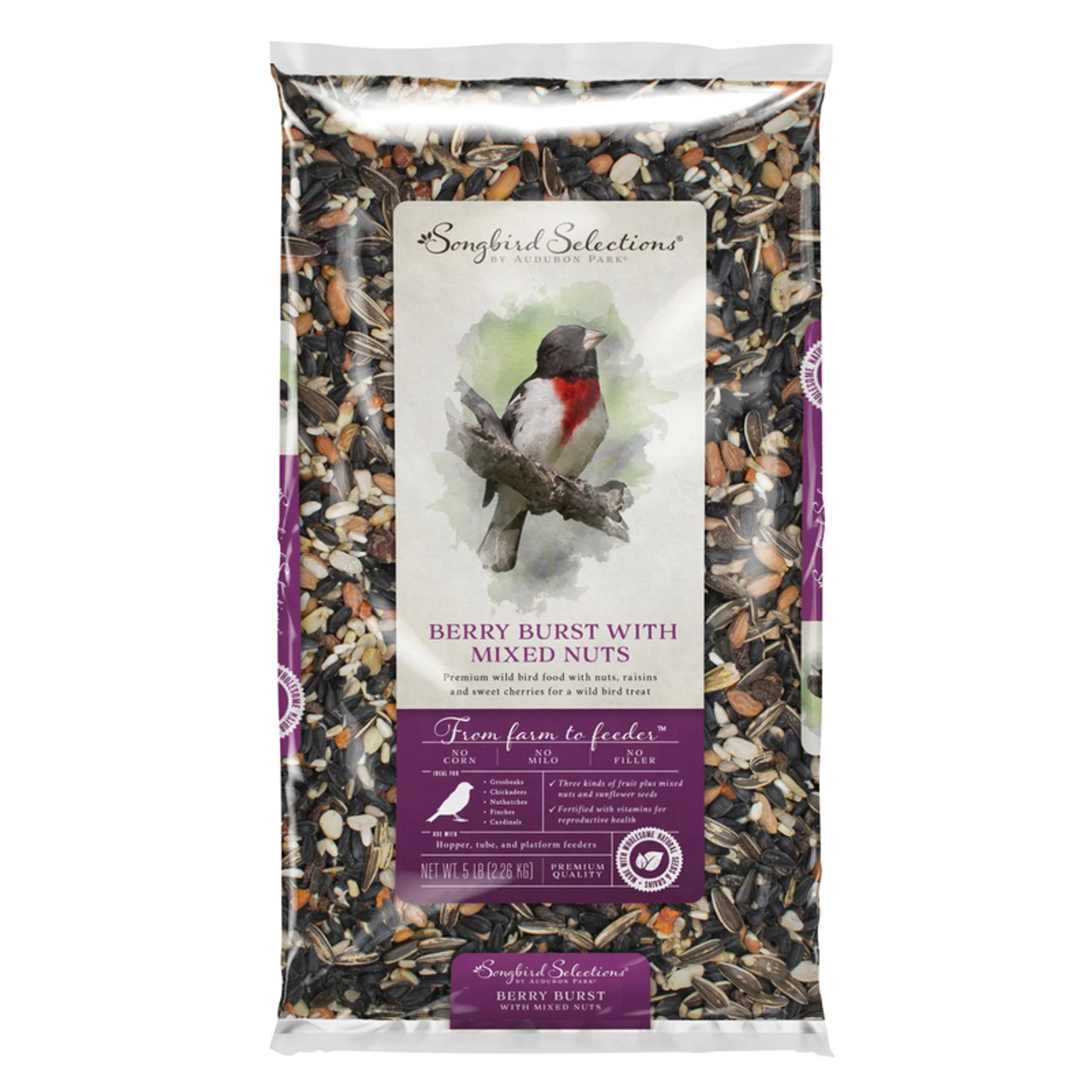 Contains 3 kinds of fruits plus mixed nuts and sunflower seeds. Fortified with vitamins for reproductive health. Ideal blend for grosbeaks, chickadees, nuthatches, finches and cardinals. Contains sunflower, peanuts, safflower, mixed feed nuts, raisins, dehydrated papaya, dehydrated cherries, calcium carbonate, mineral oil, flazseed oil, mixed tocopherois, vitamin A and E supplement, riboflavin, D- calcium pantothenate, vitamin B12 supplement, biotin and roughage. Crude protein 16%, crude fat 30.50 %, crude fiber 28%.