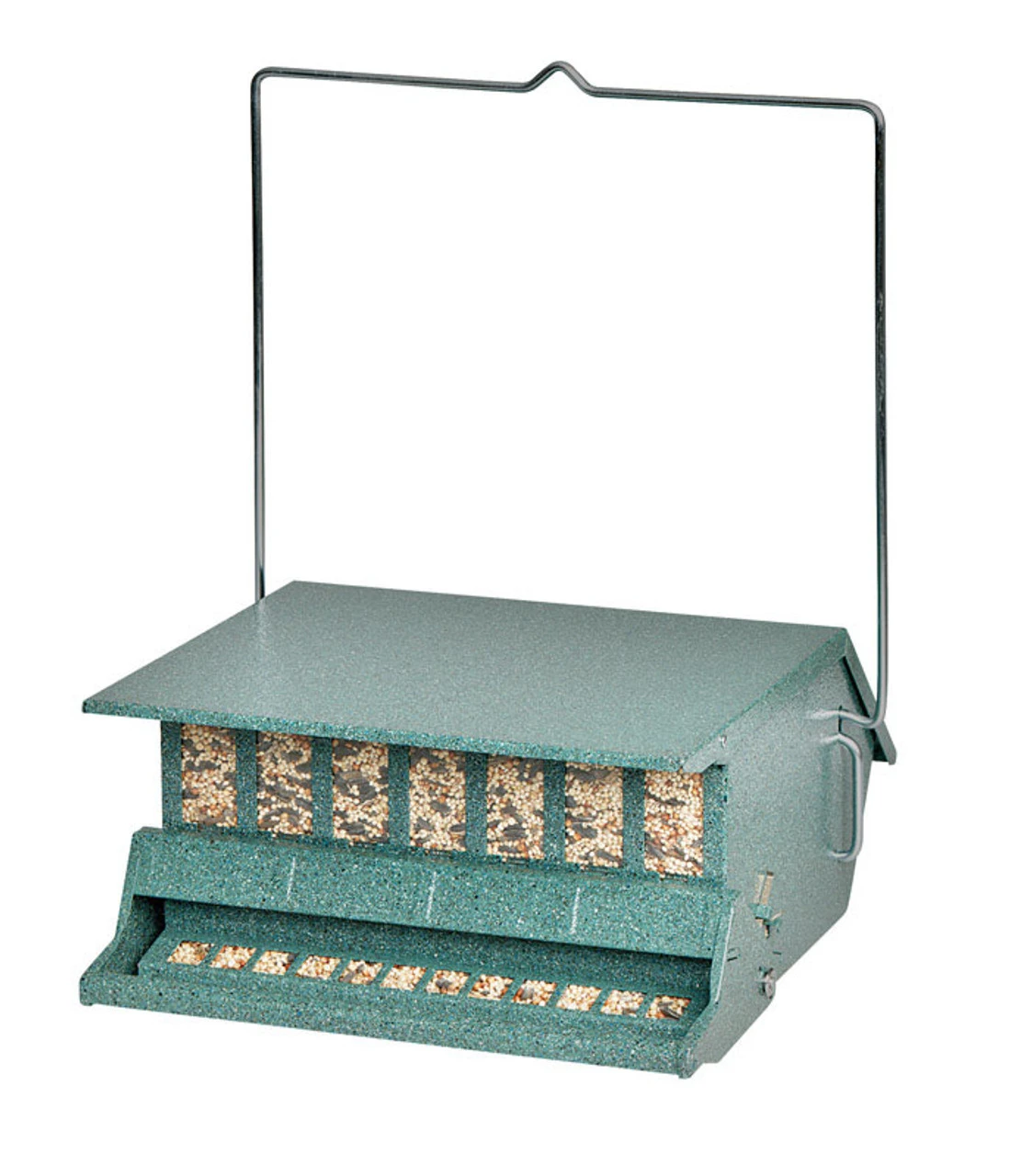 Adjustable weight setting on spring operated perch closes access to seed. Durable powder coated steel body. Pole mounting hardware (only) and hanger included. 9 lb. mixed see capacity.