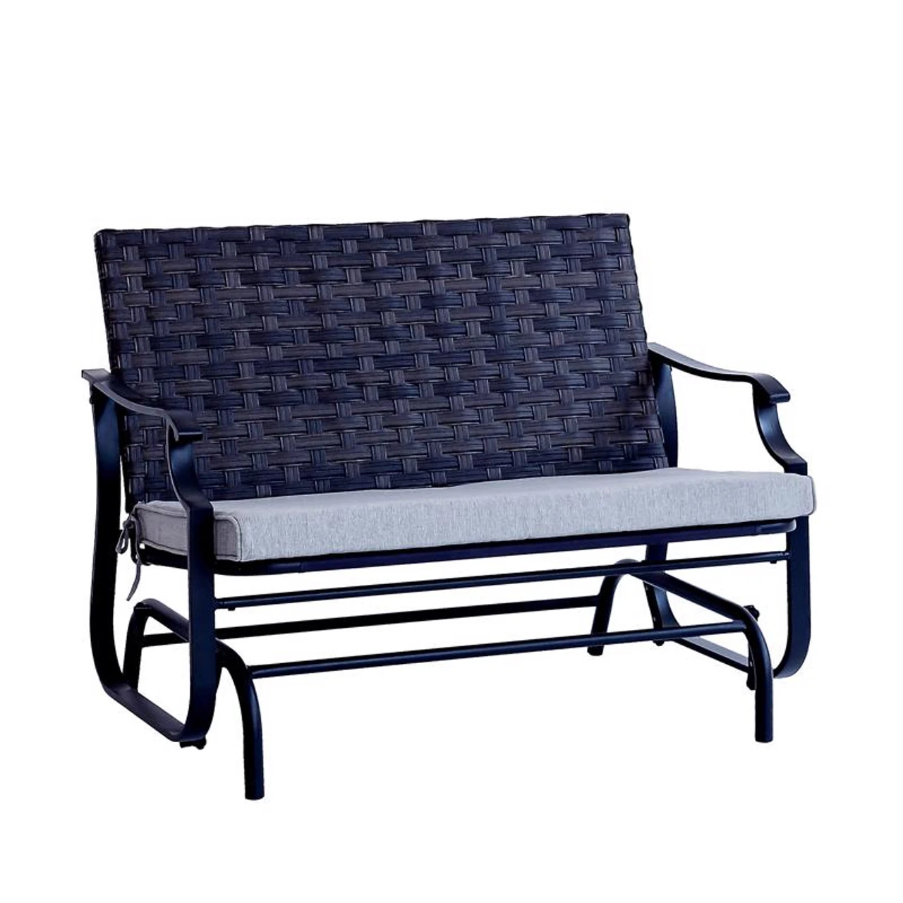 Wicker Cushion Glider features a comfortable, removeable cushioned seat made from durable sling fabric. The wicker trim is dark brown with grey cushions made of olefin fabric. Bring the set indoors during harsh weather.