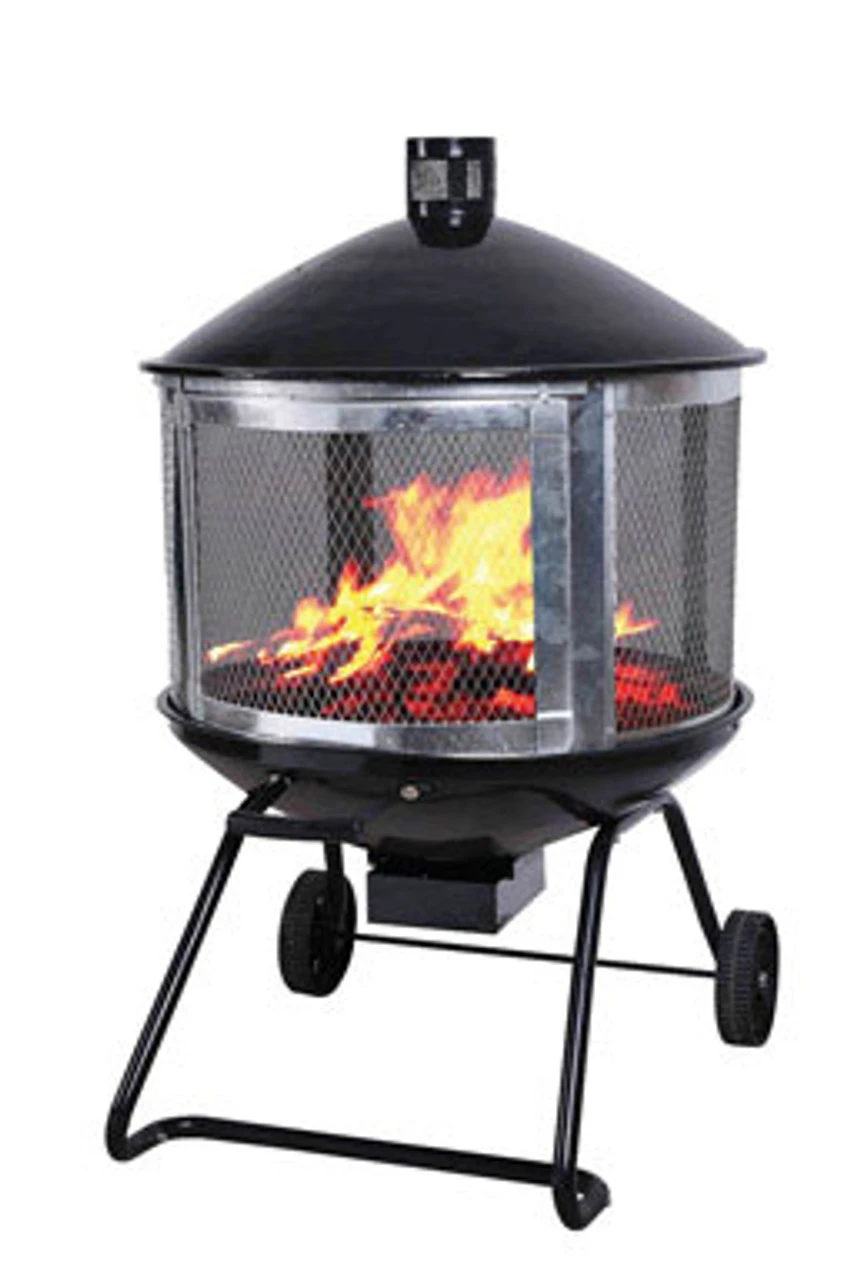 *28*Porcelain baked top lid andbottom bowl with removablezinc plated fire screencreate a longer lasting fire*Black tube legs*Rear wheels and solid woodpull handle make it simplerto move*Patented one door design foreasy log access*Includes log grate*Steel
