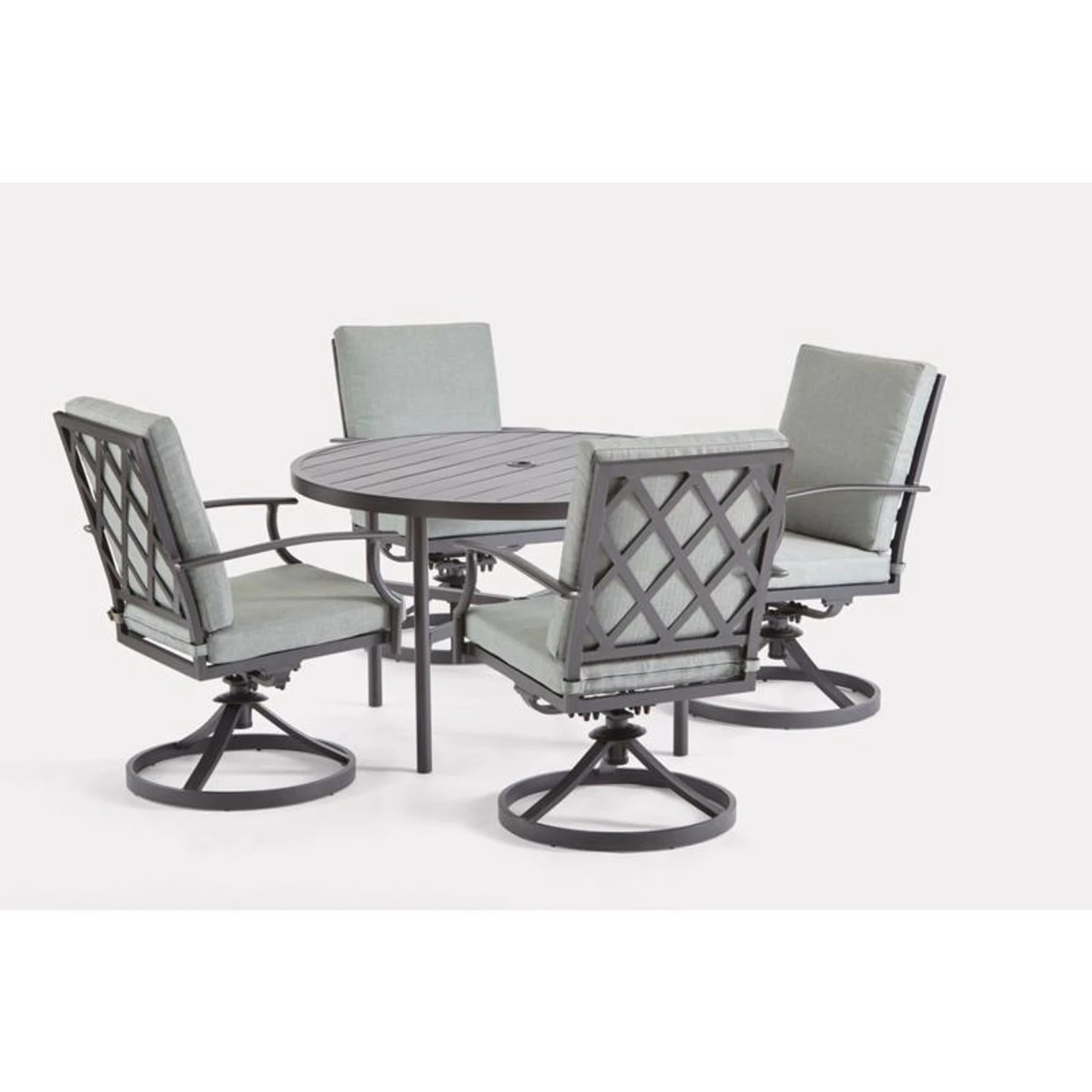 The Shore Acres collection has that effortless sense of classic styling that will enhance any home style. Featuring swivel rockers around a decorative slats dining table in a black frame with seat cushions.