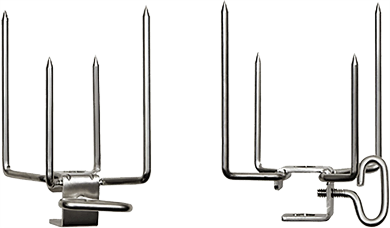 You can grill more than one piece of meat on the rotisserie at once with the Napoleon Commercial Quality Rotisserie Forks. They come with two 4-pronged forks that slide easily to hold your meat in place and thumb screws to hold the forks on the spit. These Rotisserie Forks are made entirely of stainless steel, cleaning easily after use. Replacement forks for and rotisserie with 12mm hex rod or 8mm square rods.