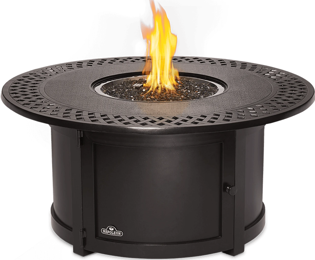 Entertain your friends and family in luxury and style with the Kensington Round Patioflame® Table. Lightweight and rust-resistant, the aluminum body allows the table to be moved comfortably around your backyard depending on your desired situation. A rustic bronze finish with a woven pattern, lends a subtle luxury, which is further customizable with the addition of colored glass. The Napoleon Kensington Round Patioflame® Table includes a matching burner cover and an access door to hide the propane tank. Use the Napoleon Kensington Round Patioflame® Table to extend your entertaining well past dark.