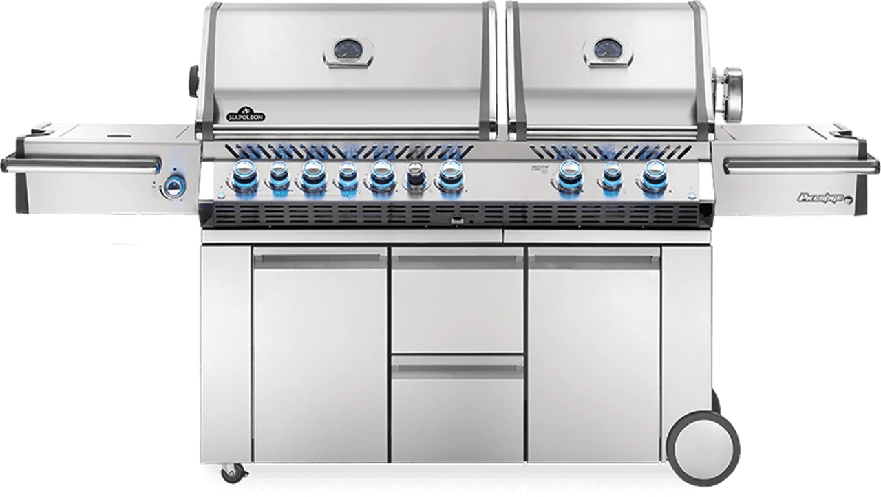Napoleon’s Prestige PRO™ 825 Propane Gas Grill with a Power Side Burner and Infrared Rear and Bottom Burners proves that two heads are better than one. On the outside, a shining stainless steel body provides durability against the elements while chrome details add luxury. The LED Spectrum NIGHT LIGHT™ Control Knobs have near limitless color options making night-time entertaining a breeze; they also glow red when the gas is left on as a safety feature. You’ll know it’s a Napoleon with the iconic WAVE™ cooking grids for those distinctive sear marks. The main grill head is big enough to grill for a crowd and provides loads of gas powered cooking, including turning your grill into a smoker with the integrated smoker tube and dedicated burner. The second head features two ceramic infrared burners that reach high heat in seconds, ideal for searing restaurant quality steaks. The Prestige PRO™ 825 also has a two-stage power side burner with a reversible cooking grid ideal for sauces, sautes and side dishes. Enjoy evenly cooked restaurant style meals with the rear infrared burners and rotisserie.
