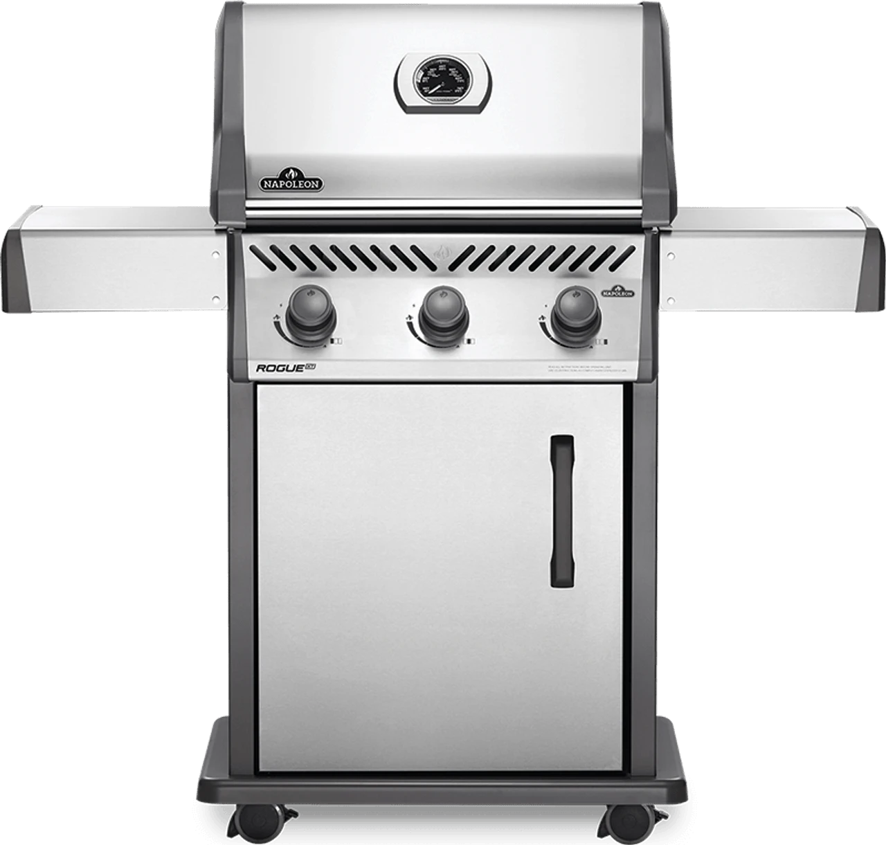 Napoleon’s Rogue® XT 425 Stainless Steel Propane Gas Grill has three burners, stainless steel grids and a high top lid. This grill lights easily, every time, with a battery-free ignition. Dual-level stainless steel sear plates incinerate drippings keeping the grill clean and providing even heat. The durable finish is both stylish and easy to maintain.