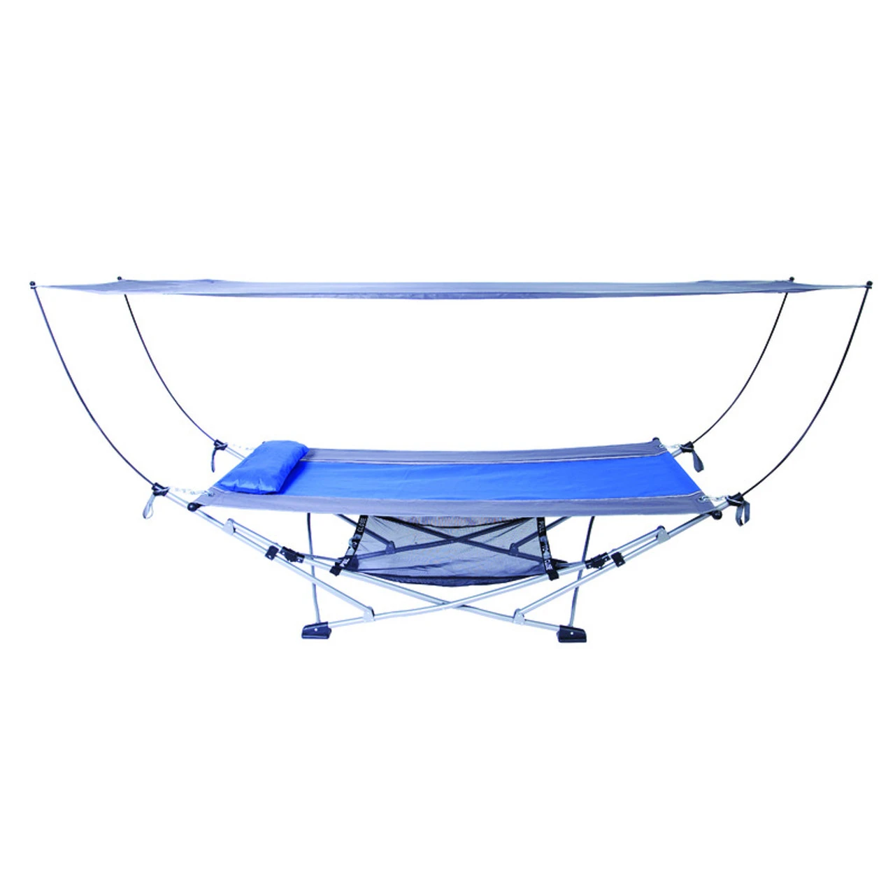 Take our easy to carry portable foldaway hammock with you anywhere-beach, camping, poolside, park and backyard. Great for sun bathing or a quick nap. Sturdy steel frame sets up quickly.