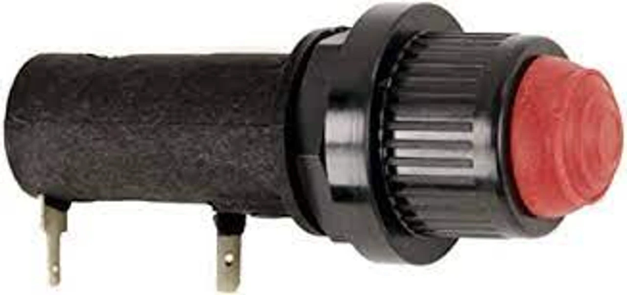 Red push button ignition switch for Weber Summit “Silver/Gold/Platinum” models. Features “Red” soft top push button/battery cap with battery spring, two male flat spade wire terminals and a mounting “lock nut ring”. Requires “AA” battery. (Battery not included).