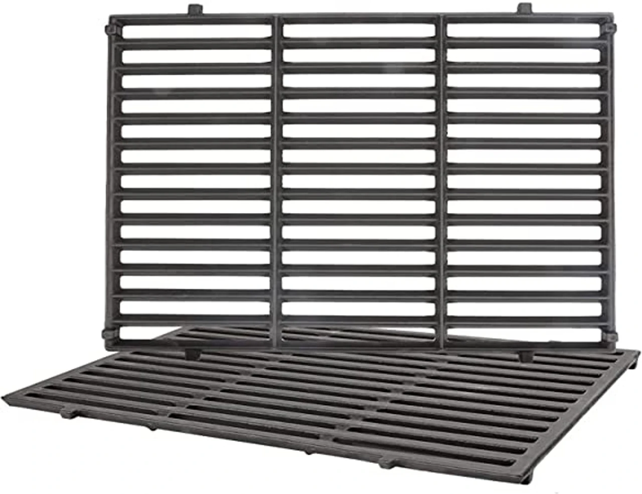Two porcelain enameled cast iron cooking grates. Each piece measures 18-7/8″ front to back X 13-7/16″ wide, for a total set width of 26-7/8″. These grates are reversible, on one side the front to back rails are “peaked”, great for searing, and on the other side the rails are flat. Fits the Weber Genesis “II” 310 Series and many other brands/models.
