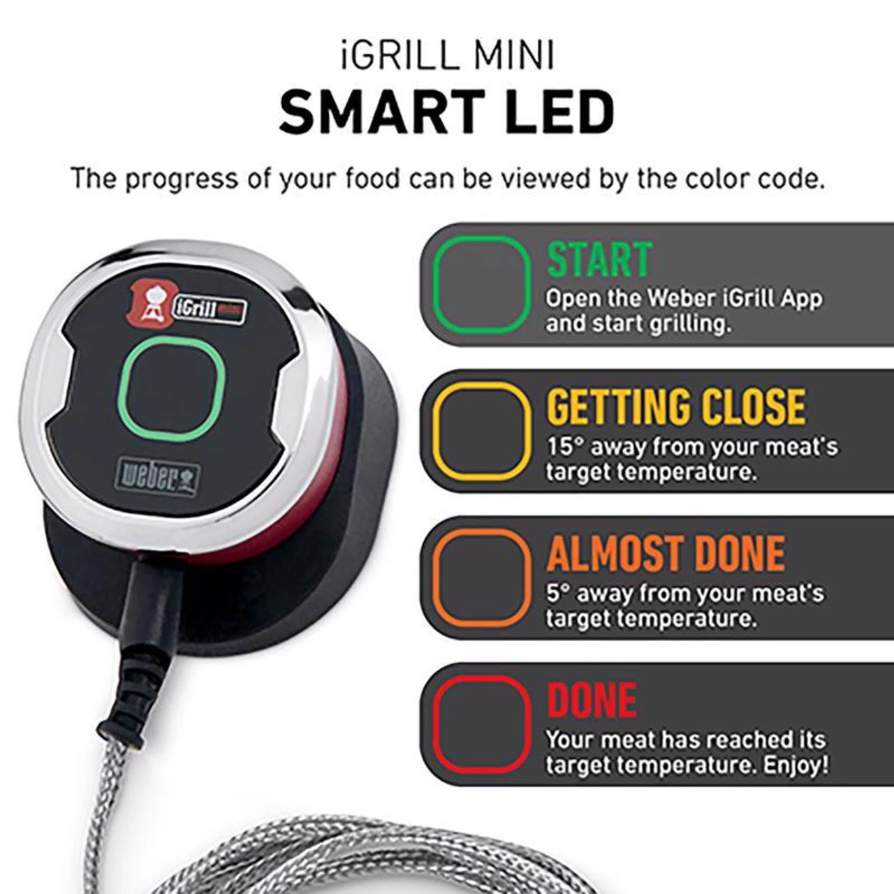 The Weber iGrill Mini offers precision grilling, every time. With 150 hours of battery life, this two-inch magnetic thermometer seamlessly pairs with your mobile device via the Weber iGrill app to immediately alert you once your food has reached your target doneness. The iGrill Mini includes Smart LED technology that guides you through a four-color food progression spectrum, so you’ll never have to lift the lid on your grill or smoker and interrupt the cooking process. Green means that you’re ready to go, yellow indicates that you’re 15 degrees from your target temperature, orange signifies that you’re within 5 degrees of the target temperature, and red means that your meat is done time to eat.